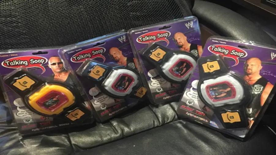 My good friend at WrestleCrap, Mr. Blade Braxton, once put said soap to the test for research purposes and was a little creeped out to hear The Rock's voice echoing about behind his shower curtain. Apparently, the soap is water activated, and the voice (either Rock or Steve Austin) will spout some sort of hygiene-related catchphrases that intertwine with their wrestling personas. Allegedly, the Austin soap tells you to "wash your ass", which should've gotten WWE sued by the estate of Redd Foxx.