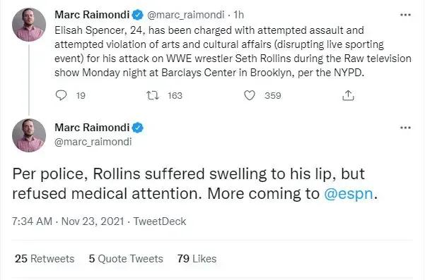 Raimondi wrote on Twitter: "Elisah Spencer, 24, has been charged with attempted assault and attempted violation of arts and cultural affairs (disrupting live sporting event) for his attack on WWE wrestler Seth Rollins during the Raw television show Monday night at Barclays Center in Brooklyn, per the NYPD.