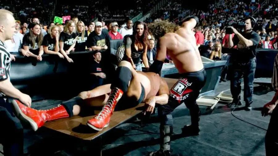Flair did the customary blade job, and even endured a flying splash off of a ladder through an outside table, which would've been bonkers even if he'd done it 15 years earlier. The two built genuinely-engrossing drama throughout the match, with Flair coming close to victory, only for Edge to pull the rug out from underneath. Bonus fact: 19-year-old Ashley Flair watched on from inside the arena, perhaps not knowing that 13 years later, she'd be in a TLC match of her own.