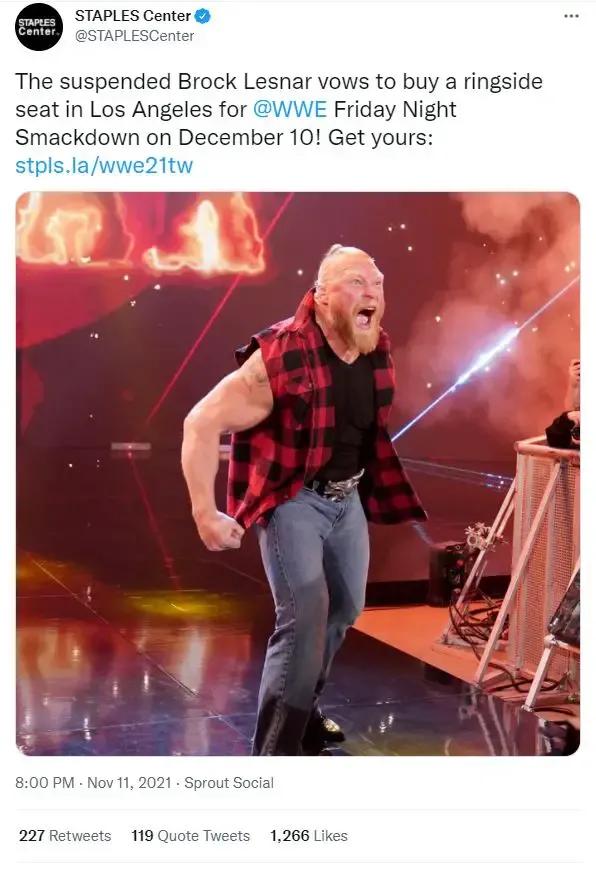 The December 10 SmackDown will air from the Staples Center, and the official Twitter account for the venue have announced that The Beast has 'vowed to buy a ringside seat in Los Angeles', and therefore be in attendance for the show.