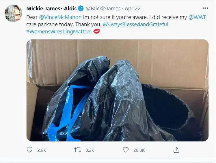 James was one of a number of releases made by the promotion on April 15, 2021 after returning to WWE in 2016. A week later, James took to social media to share a photo of a big bag with her name on it while also thanking WWE for sending her a 'care package'.